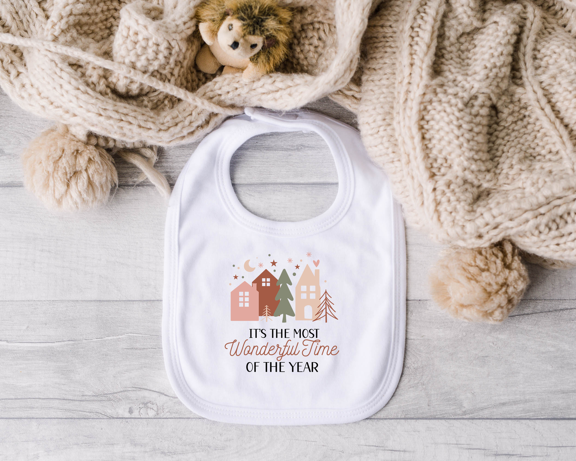 Get in the holiday spirit with our "It's The Most Wonderful Time of The Year" bib! This festive bib is perfect for keeping your little one's outfit clean during mealtime. Plus, it's a great way to spread some holiday cheer!